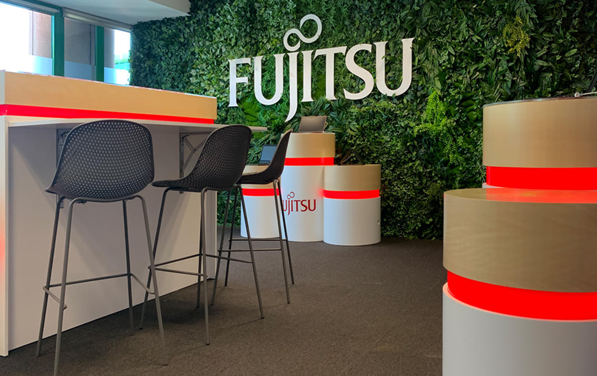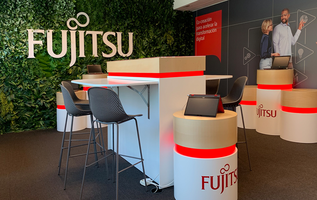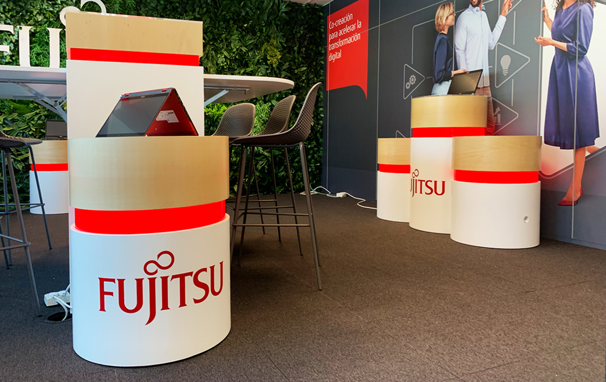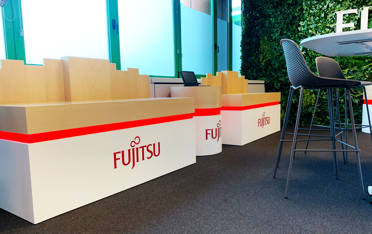 La conocida agencia de comunicación Singular One nos encargó la materialización de su diseño de mobiliario para la prestigiosa firma internacional Fujitsu, así como colocación de corpóreos, jardín vertical, etc. Todo el conjunto es autoportante, está dotado de ruedas ocultas, electrificación e iluminación led.